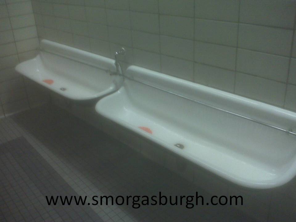 HERE IT IS! SMORGASBURGH EXCLUSIVE!!! We have the only picture of Civic Arena men’s room troughs without any dongs in it (dongs have been photoshopped out). As we wait for the arena’s demolition I wanted to give the troughs their due. What memories! Concentrating oh so carefully to take a leak while not making any eye contact or inadvertently seeing someone else’s penis. There was always one crazy drunk guy who stood at the very end of the trough, though, peeing perpendicularly to everyone else. He was all like “I’M CROSSING ALL Y’ALL STREAMS MOTHERFUCKERS! HA HA HA. AND I’M LOOKING AT YOUR DICKS!” That guy was hilarious! You almost didn’t mind him looking at your dick.